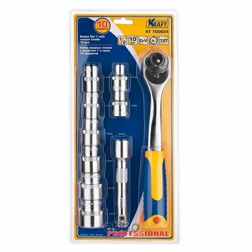 Набор торцевых головок с трещоточной рукояткой (10 шт; 1/2" Dr; 10-24 мм) Kraft KT 700624 .