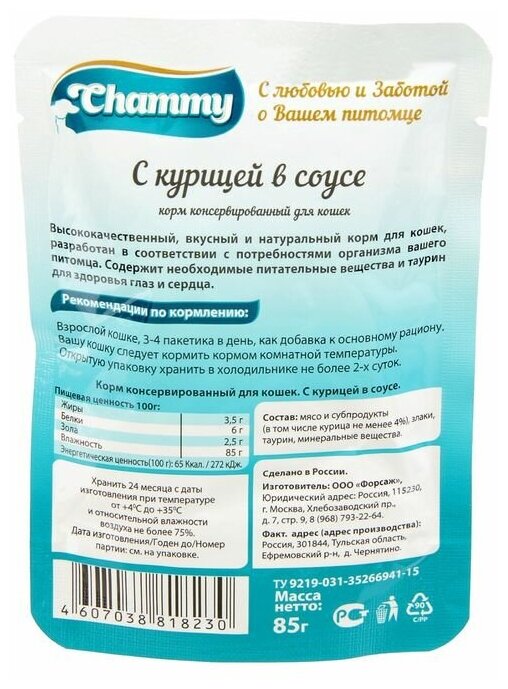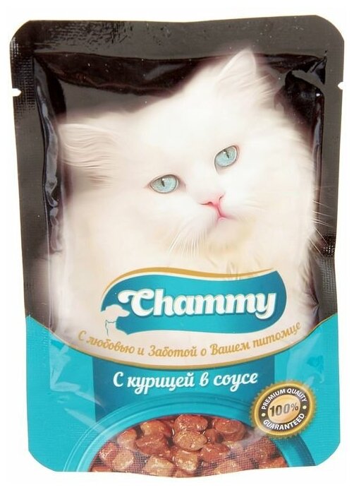 Влажный корм Chammy для кошек, курица, кусочки в соусе, пауч, 85 г