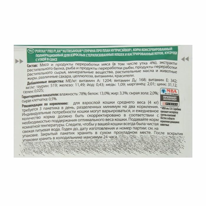 Pro Plan Nutrisavour Sterilised пауч для стерилизованных кошек и котов (кусочки в соусе) Утка, 85 г. упаковка 26 шт