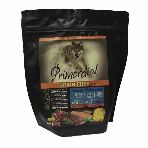 PRIMORDIAL Сухой корм для собак беззерновой, форель, утка, 400 г, PRIMORDIAL