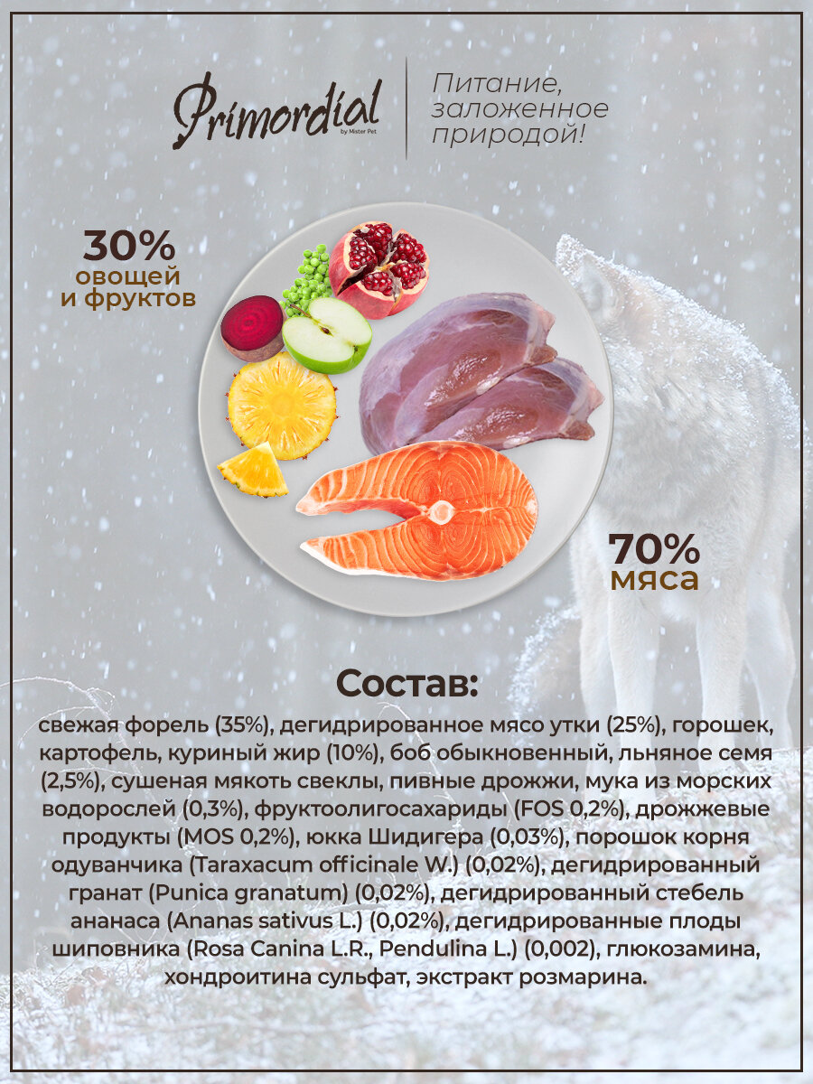 Корм сухой для собак PRIMORDIAL беззерновой форель и утка 12кг №1