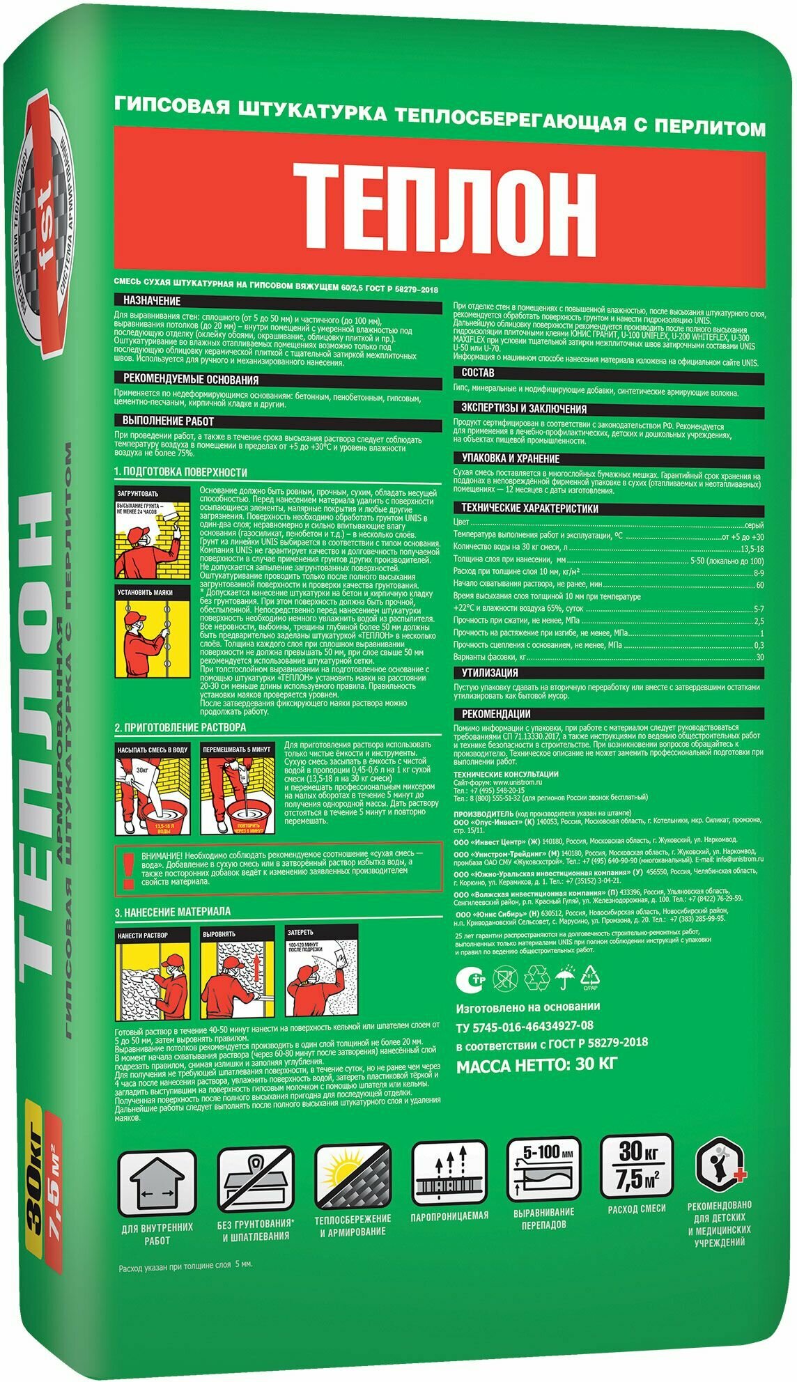 Ниже Вы можете прочитать отзывы на Штукатурка базовая гипсовая UNIS Теплон Армированный 30 кг, ознакомится с подробными характеристиками, посмотреть интересные обзоры и фотографии на Штукатурка базовая гипсовая UNIS Теплон Армированный 30 кг.