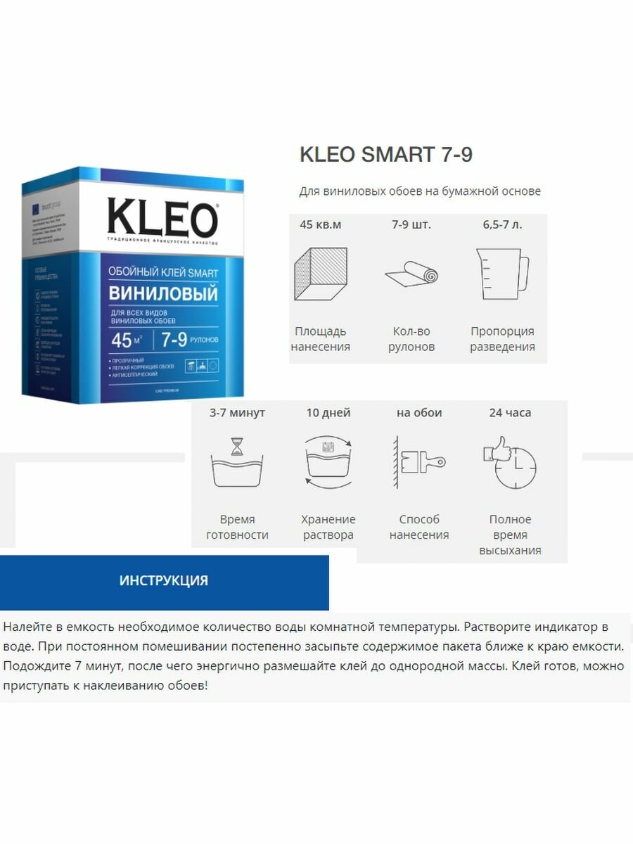 Ниже Вы можете прочитать отзывы на KLEO SMART 7-9, Клей для виниловых обоев, сыпучий 200 гр., ознакомится с подробными характеристиками, посмотреть интересные обзоры и фотографии на KLEO SMART 7-9, Клей для виниловых обоев, сыпучий 200 гр..