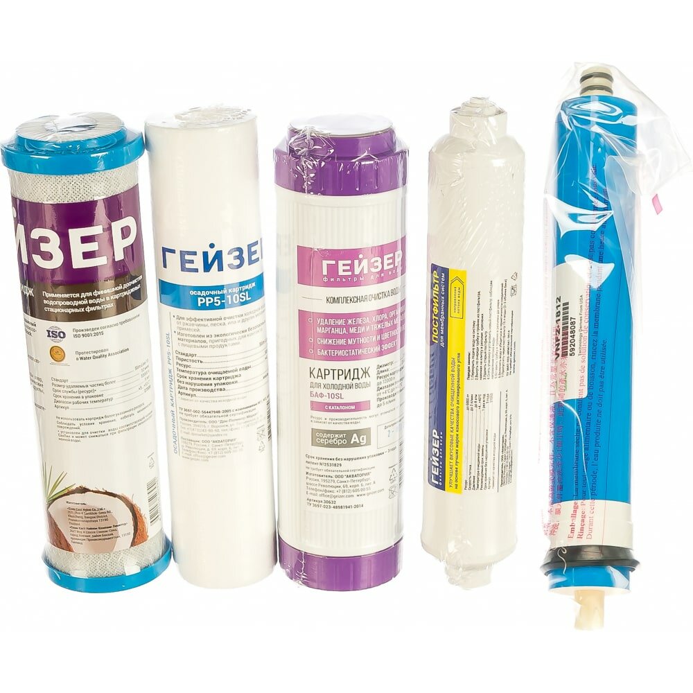 Комплект самосборный. Три предфильтра в упаковке "Гейзер-стандарт", мембрана и постфильтр отдельно.