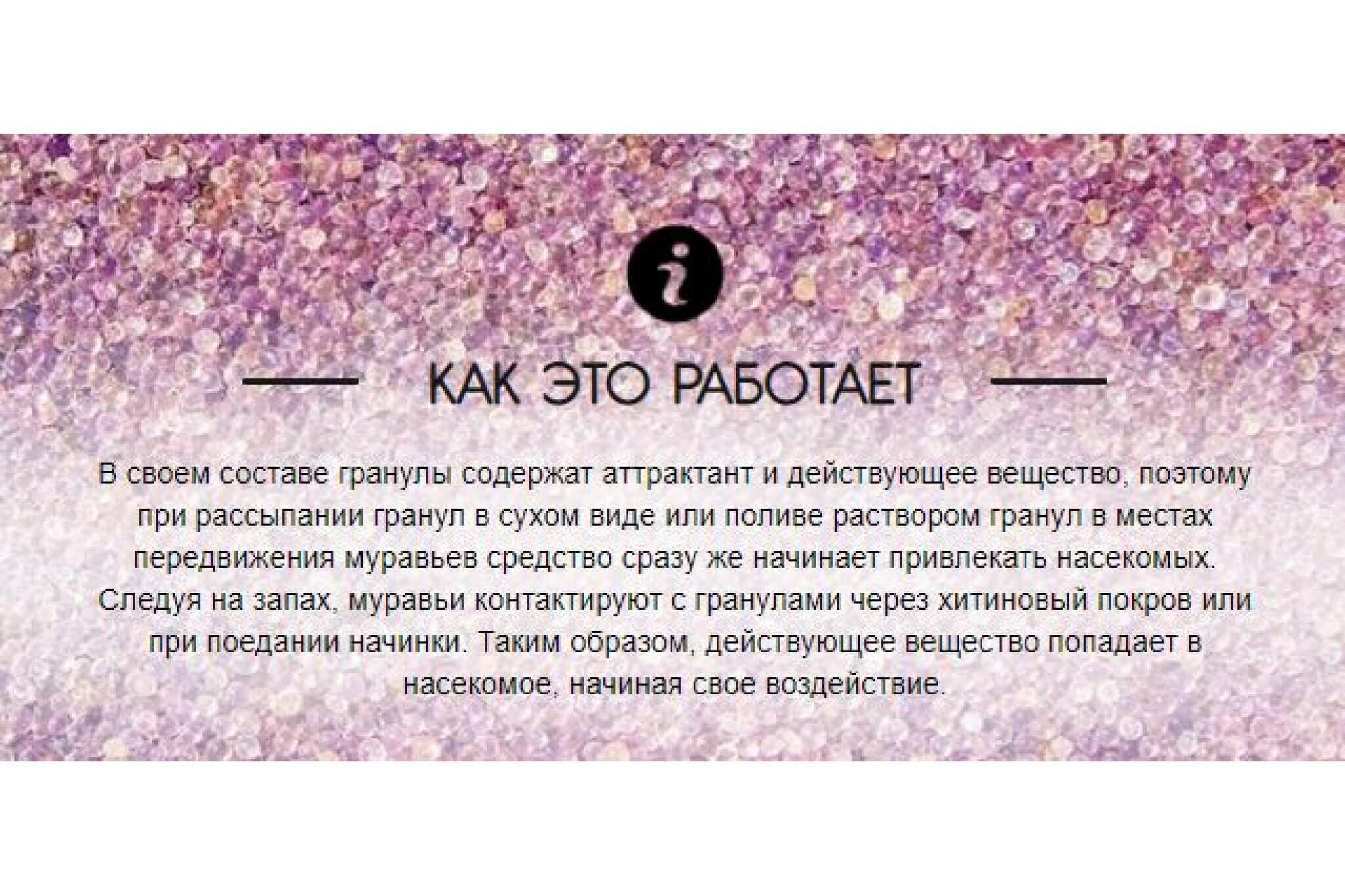 | Минусы: | Если делать ловушки с средством внутри, то эффекта почти нет - ползают мимо и почти не обращают внимание. Эффект появляется если буквально рассыпать гранулы по поверхности где ползают муравьи - тогда довольно быстро они уходят. Но это неудобно и возможно не безопасно - не будешь же на стол яд сыпать |