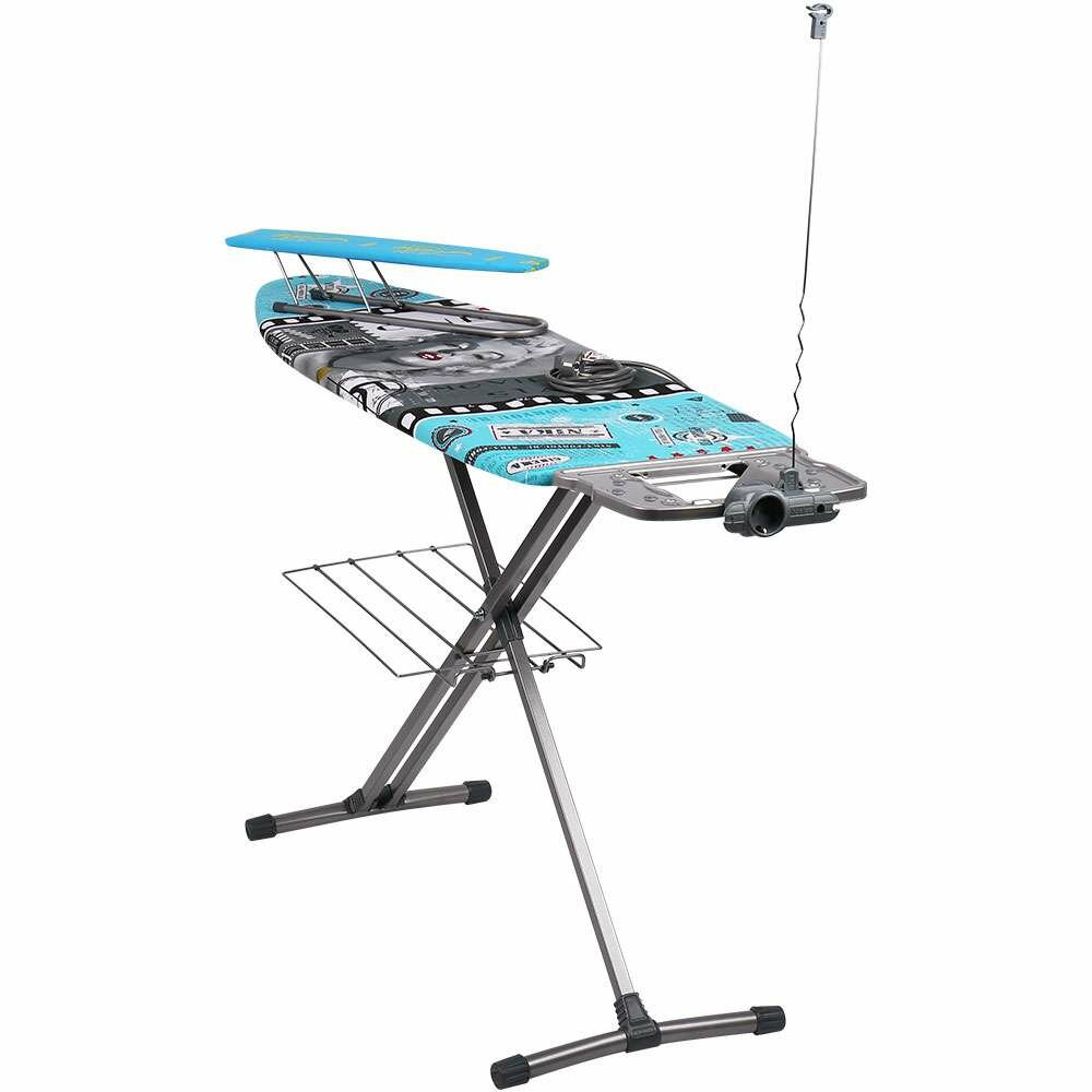 | Плюсы: | Широкая, устойчивая, есть удлинитель розетки, "антеннка" для провода утюга и полочка, удобная регулировка высоты |