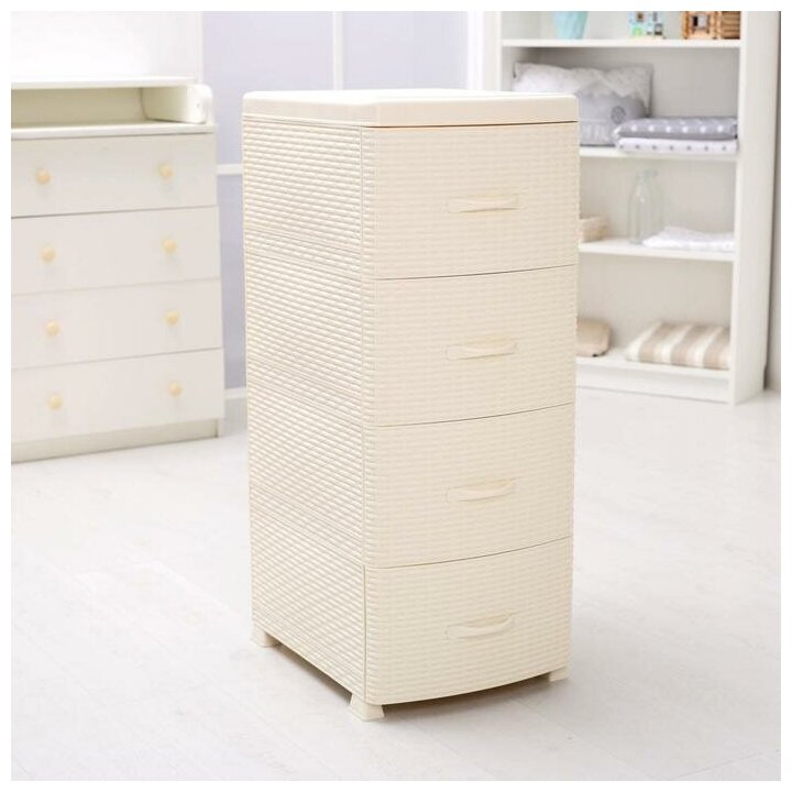 Комод пластиковый Ротанг с 4 ящиками / универсальный стеллаж для хранения вещей / органайзер для аксессуаров, цвет слоновая кость