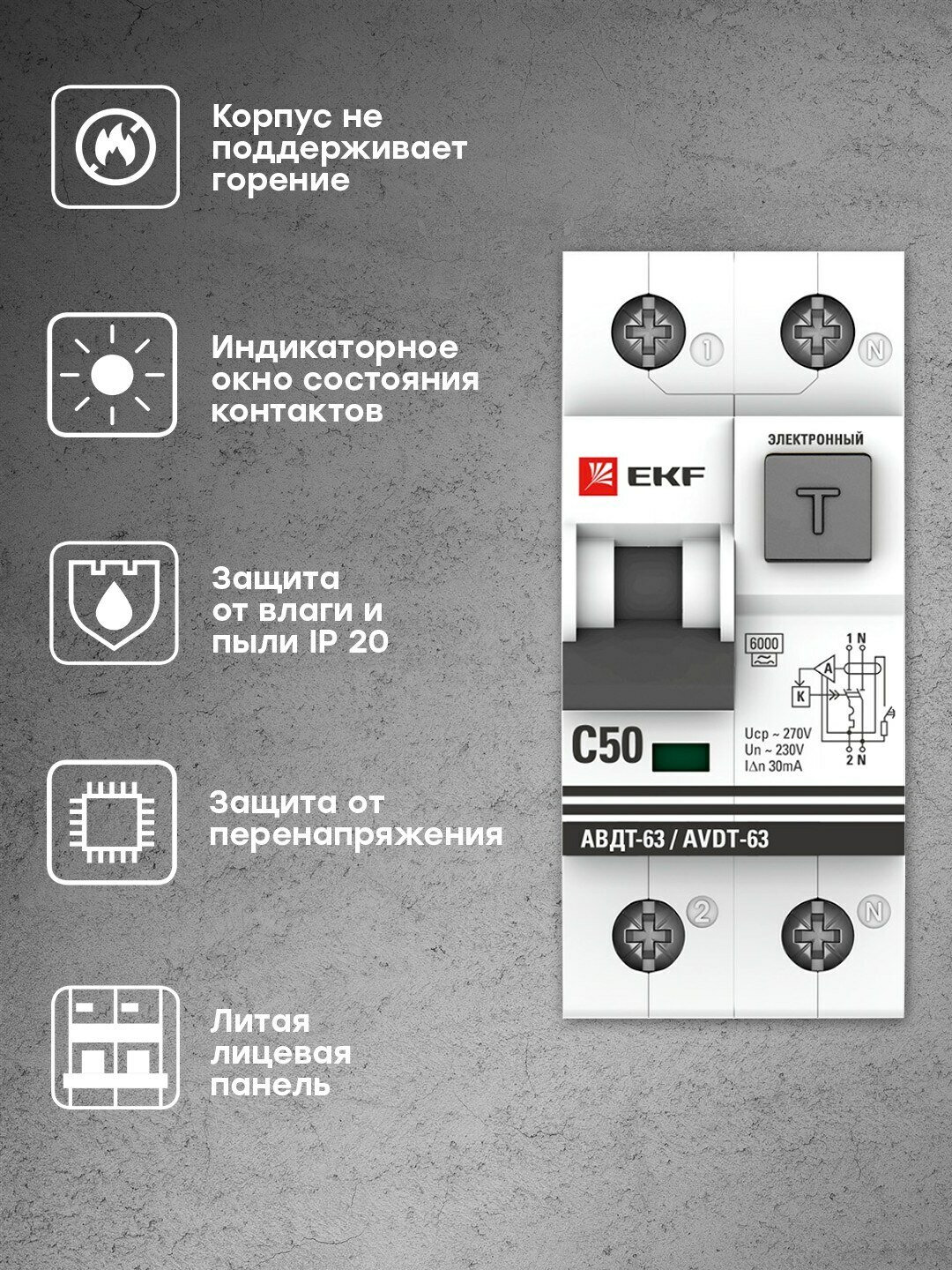 Дифференциальный автоматический выключатель EKF PROxima АВДТ-63 50А, С, 30мА, тип A, 6кА, электронный