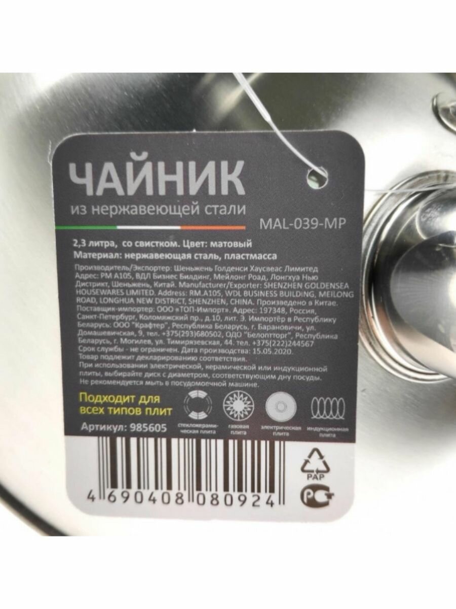 Чайник из нерж. стали MAL-039-MP, 2,3 литра, матовый, со свистком 985605
