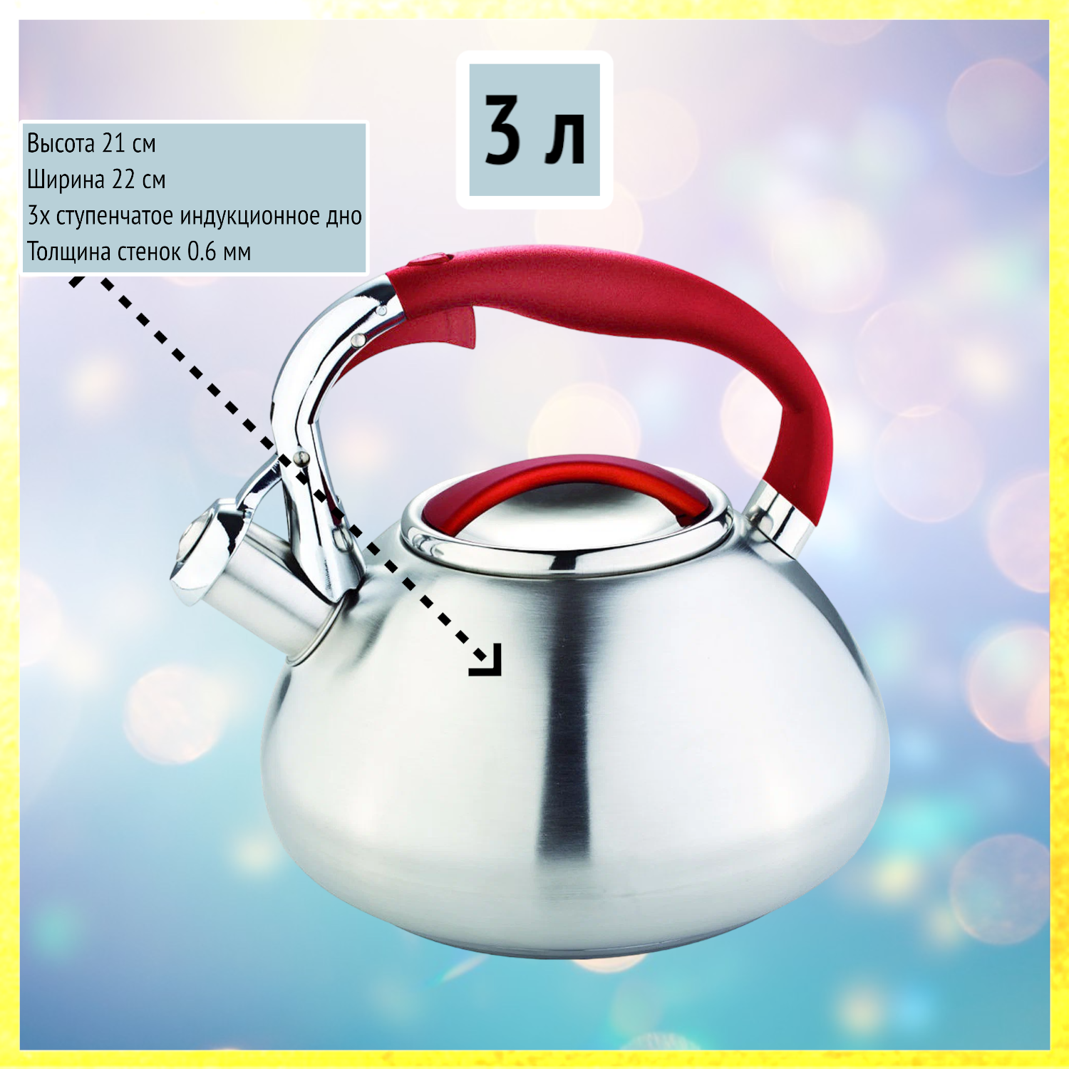 Чайник 3 л из нержавеющей стали со свистком, Rainstahl, RS-7602-30WK, красная ручка интересное: