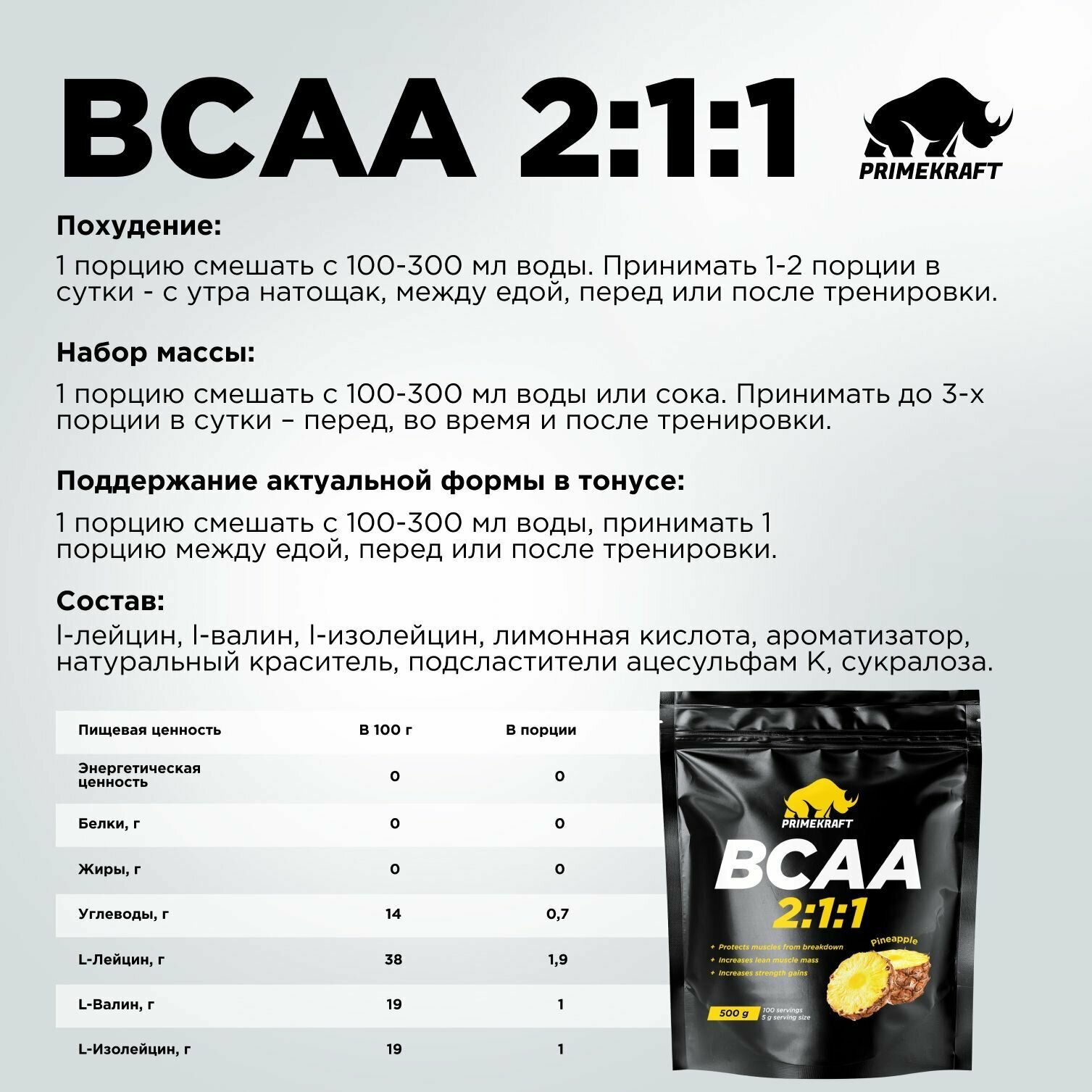 Аминокислоты PRIMEKRAFT BCAA 2:1:1 (БЦАА), Ананас, 500 г / 100 порций