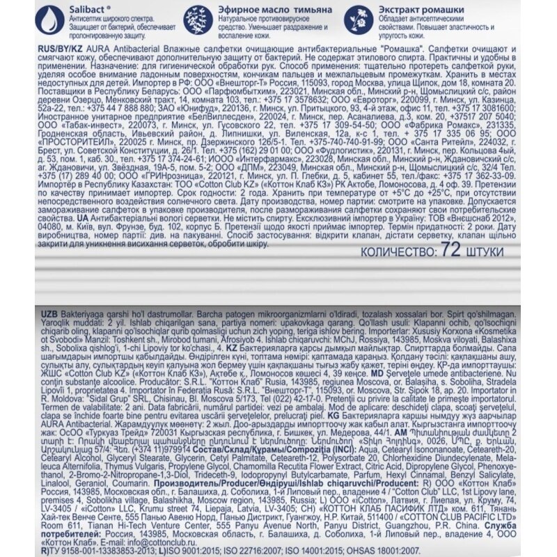 Aura Влажные салфетки антибактериальные с ромашкой 72 шт , 3 упаковки