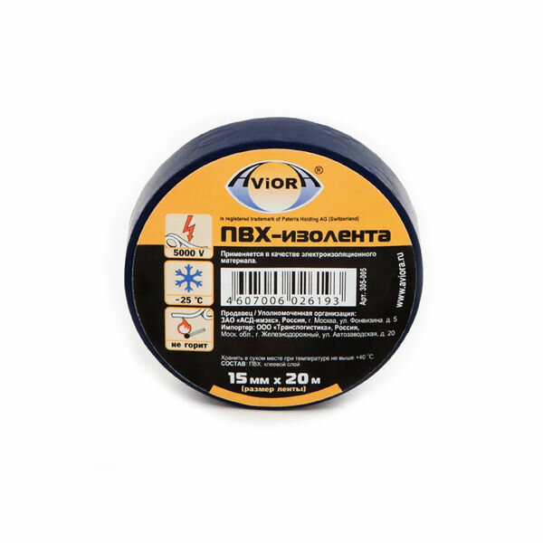 Изолента AVIORA ПВХ, 15 мм, 20 м, синяя 305-005