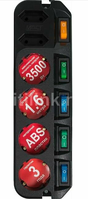 | Плюсы: | Выключатель на каждую розетку (исключение - на 2 узкие розетки 1 выключатель), есть 2 узкие розетки, качественный сетевой фильтр, прочный пластик. |