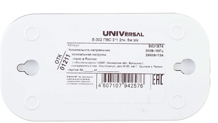 Универсал удлинитель бытовой 9631972 на 2 гнезда ПВС 3Х1 3500-3880Вт с/з 2м / UNIVERSAL удлинитель бытовой на 2 гнезда ПВС 3Х1 3500-3880Вт с заземлени