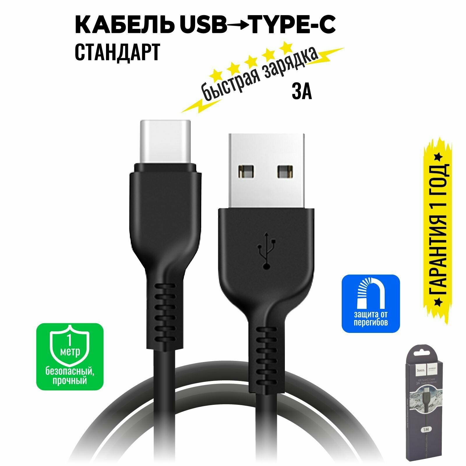 Кабель зарядка Hoco X20 Type-C 3A , 1 метр, черный, для быстрой зарядки iPhone, Android