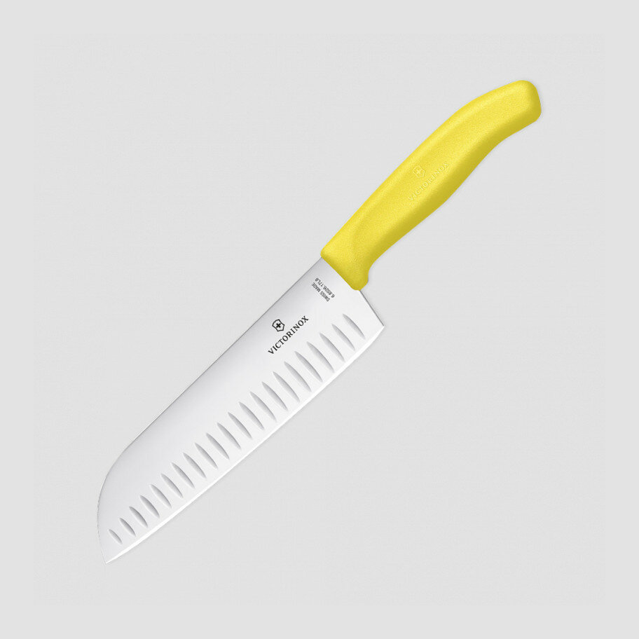 Нож Santoku VICTORINOX Swiss Classic, рифлёное лезвие 17 см, желтый, в блистере 6.8526.17L8B