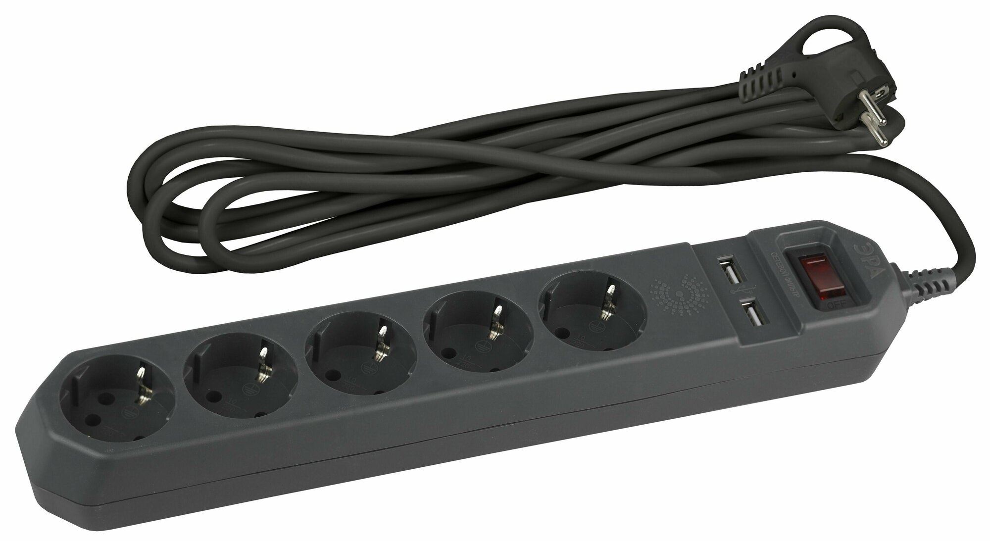 Сетевой фильтр USF-5es-1.5m-USB-B ЭРА (черный) с заземл, 3x0,75мм2, с выкл, 5гн+2USB, 1.5м