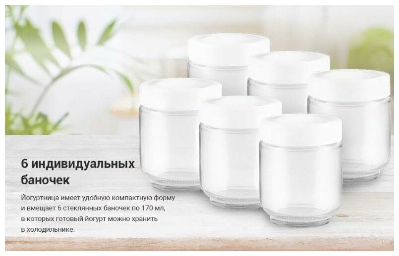 Компактные баночки рассчитанные на 170 мл каждая, огромный плюс, для ежедневного употребления суточной нормы всех питательных микроэлементов. Также не мало важно, закваски для приготовления этой полезной вкуснятины есть во всех гипермаркетах и аптеках.Йогурты получаются нежными, и самое главное в них можно добавлять различные добавочки, такие как орехи, варенье, корицу, фрукты...Отдельно хочется сказать про чистку и уход данной йогуртницы, баночки с крышками отмываются легко и без усилий, корпус протирается тряпочкой.В общем, я очень довольна приобретенным товаром, постоянно дома свежий йогурт и конечно же, пищеварение на отлично! |