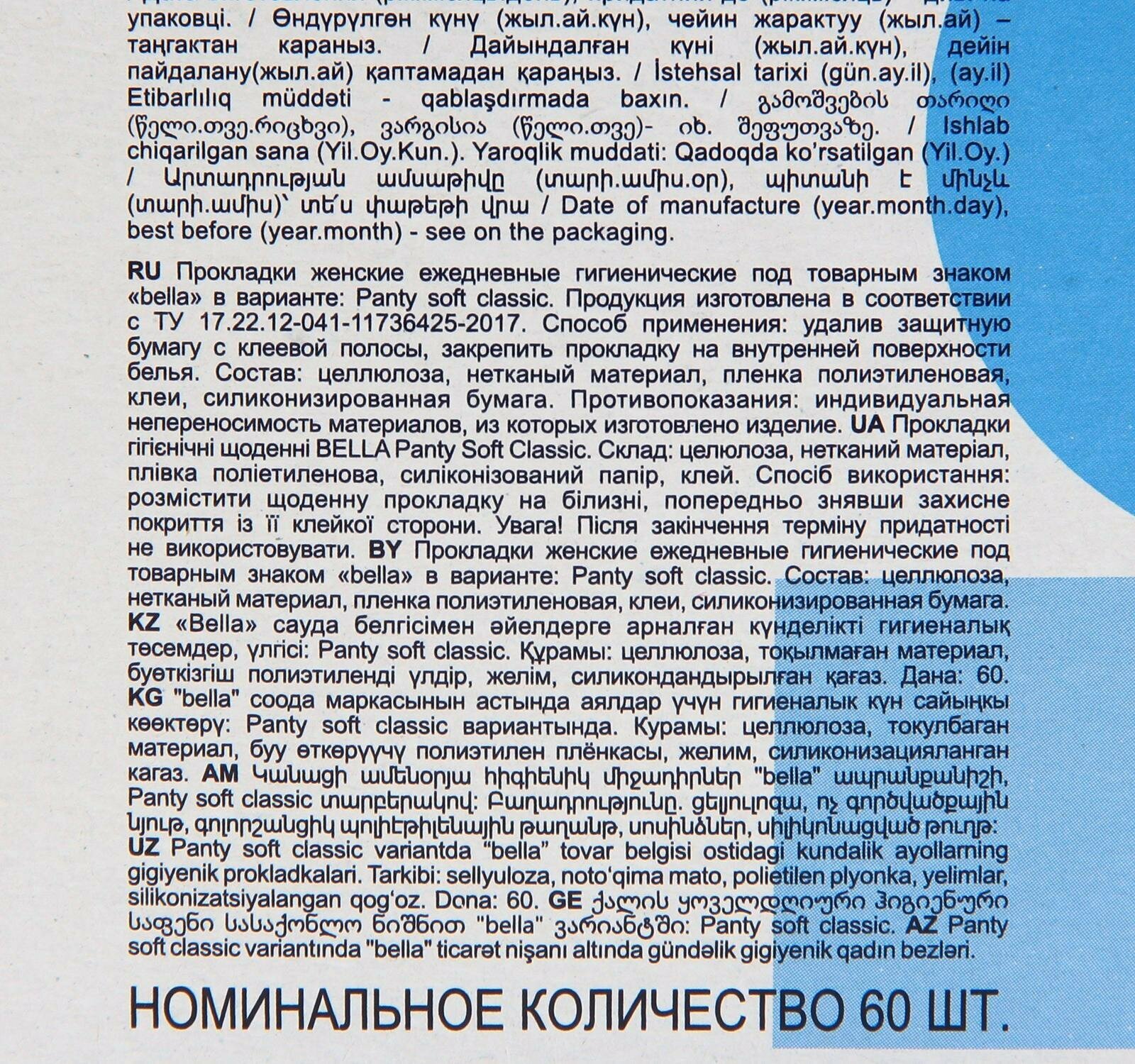 Bella PANTY Soft Classic Прокладки женские гигиенические ежедневные , 60 шт. Впитываемость 2к.