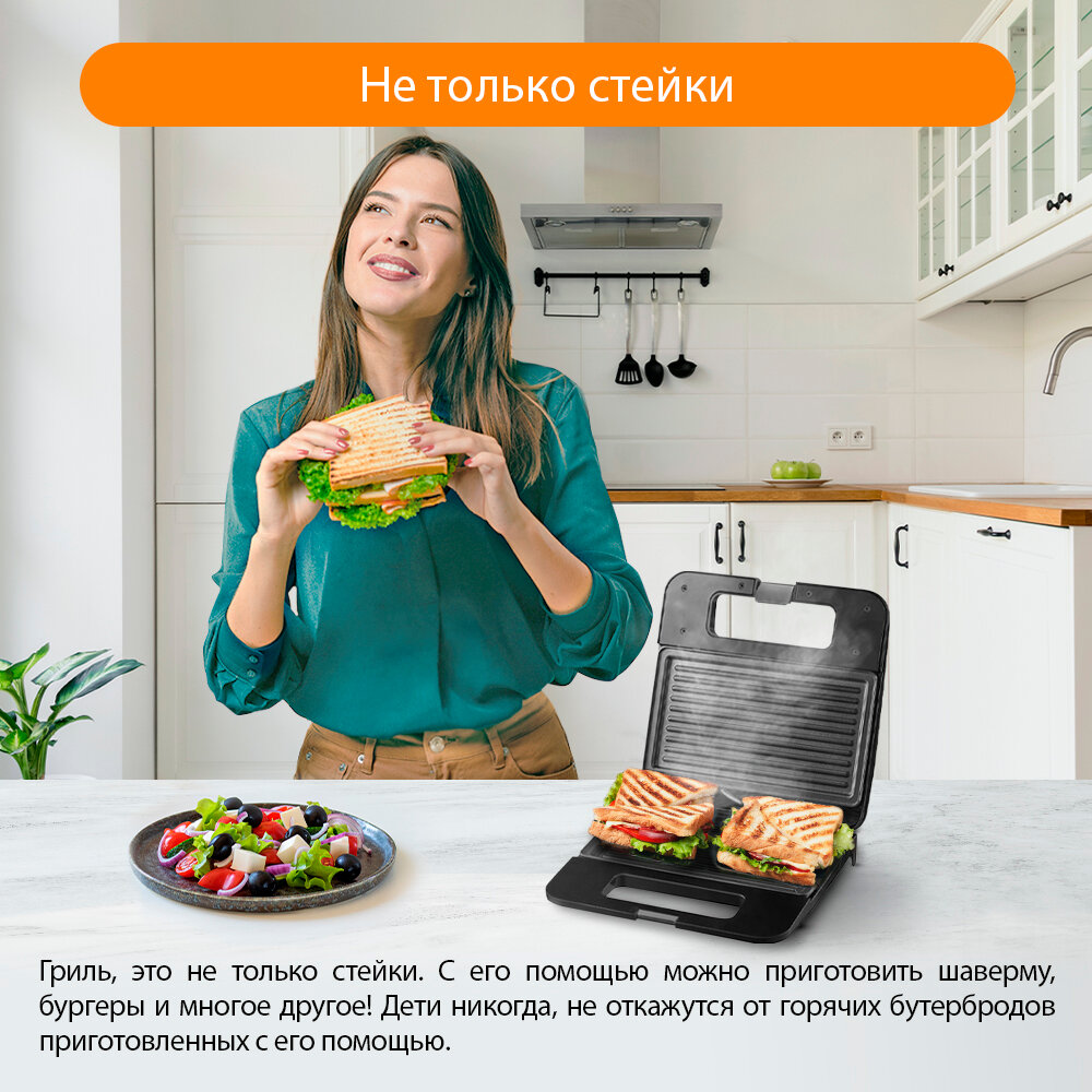 На маркете указано, что это гриль. Корректнее было бы сказать, что это бутербродница. Идеально на 2 сэндвича из тостового хлеба, но не стоит в ней готовить как в гриле! Положите туда мясо, овощи или...да что угодно, кроме хлеба и все, покрытие начнет слезать, прилипая к пище.