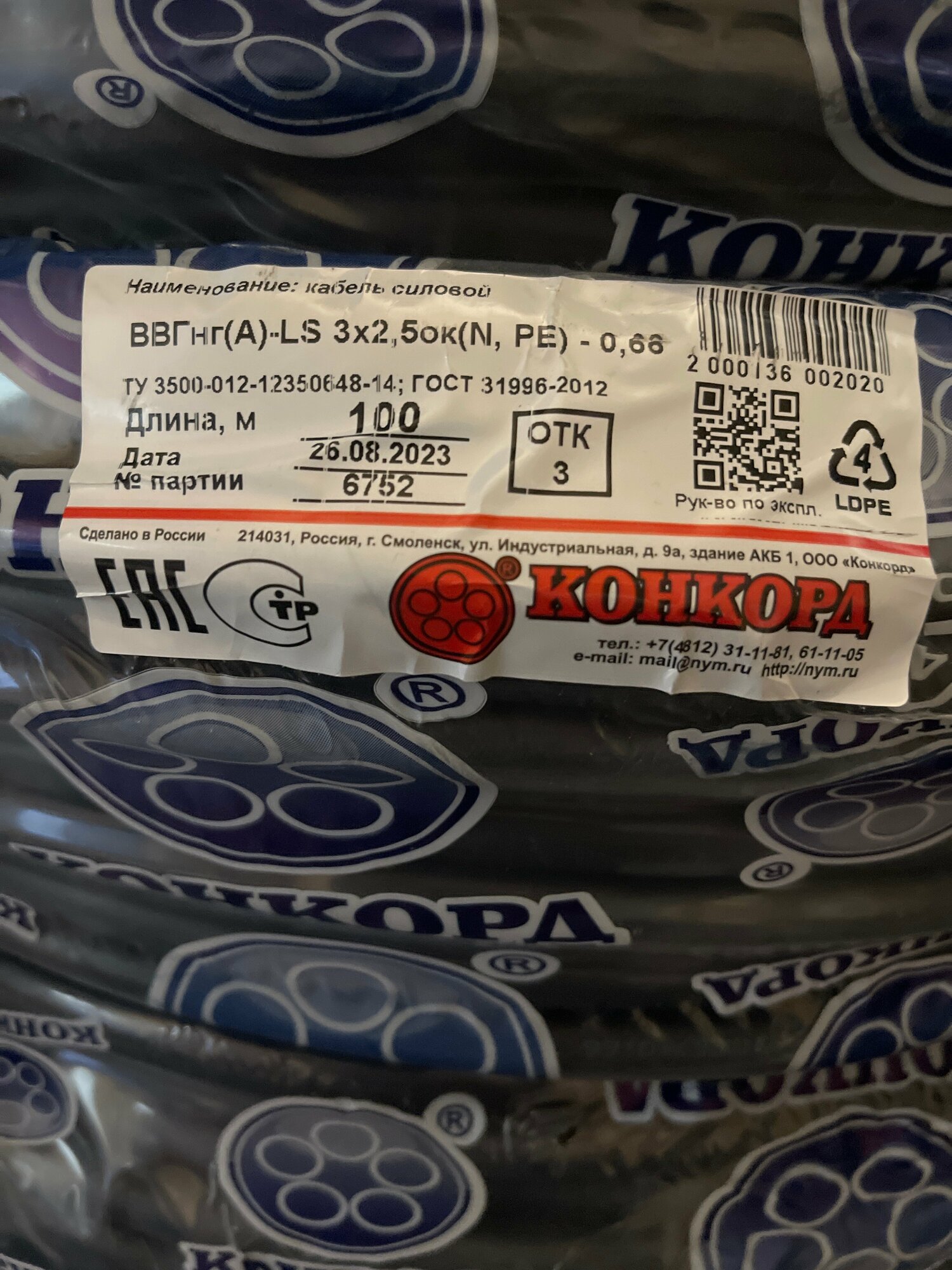 ВВГ НГ LS конкорд 3Х2,5 с зап 100м