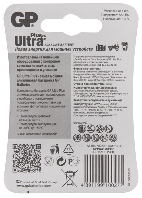 Батарейка Алкалиновая Ultra Plus Alkaline Aa 1,5V Упаковка 4 Шт GP BATTERIES арт. GP 15AUPNEW-2CR4