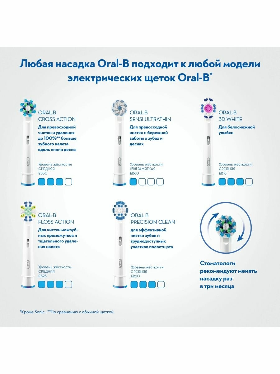 Очень хорошая электрическая зубная щетка Oral-b с большим запасом насадок которых хватит больше чем на целый год ежедневной чистки Зубов. Это щетка очень простая в использовании и очень удобная, с первого же дня разобралась как ей пользоваться и теперь наслаждаюсь ежедневной чисткой Зубов. Для меня важно хорошо вычищать зубы и я чищу три раза в день, а с покупкой этой щетки я заметила, что зубы стали намного более светлыми и удаляется отлично весь зубной налёт, так что мне не приходится теперь так часто ходить на профессиональную чистку и полировку Зубов. Щетка очень красивая и удобно держать её в руки, она совсем не тяжелая. Довольна ее работой и чистотой своих зубов.