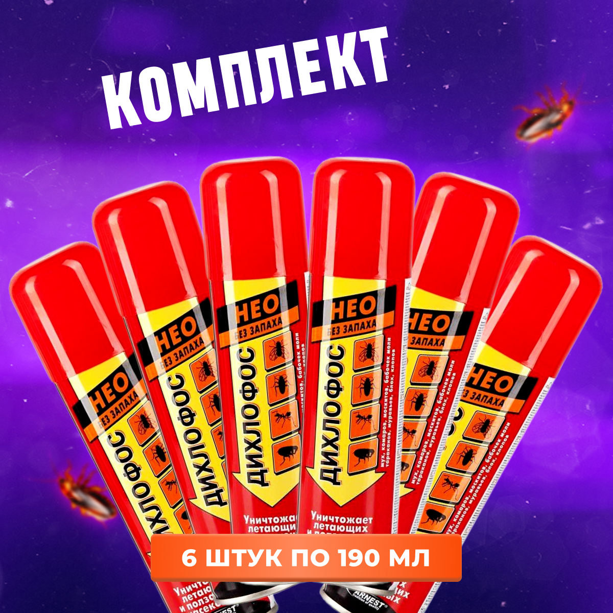 Средство от насекомых 190 мл дихлофос НЕО без запаха от всех видов насекомых, 6 шт