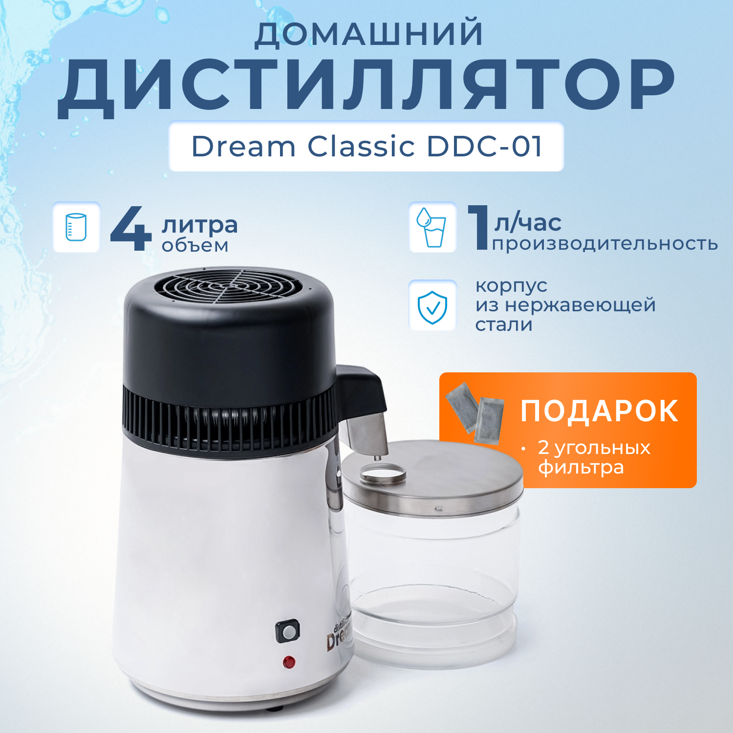 Отличный аппарат. Свою работу выполняет должным образом. Стеклянная тара сбора воды.