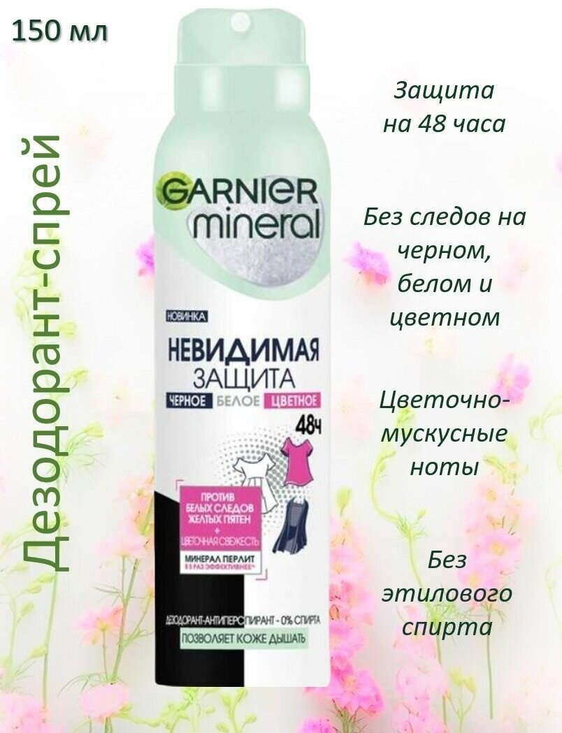 Дезодорант-антиперспирант женский Гарньер Mineral Невидимая защита черное, белое, цветное 48ч спрей цветочная свежесть 150мл / от пота и запаха