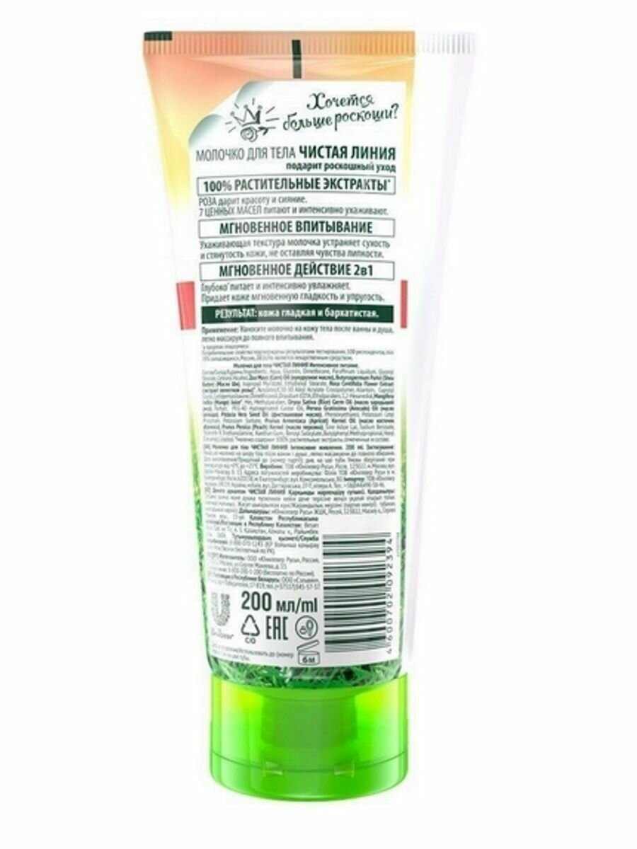 Молочко для тела чистая линия Интенсивное питание, Роскошный уход 2в1, 200 мл