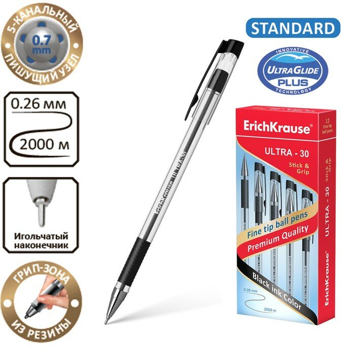 Купить Ручка шариковая Erich Krause ULTRA-30, узел-игла 0.7 мм, чернила чёрные, резиновый упор, длина линии письма 2000 метров, 12 шт.