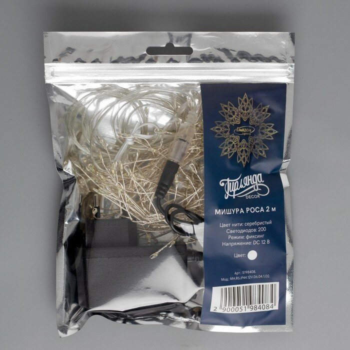 Гирлянда «Мишура» 2 м роса, IP20, серебристая нить, 200 LED, свечение белое, 12 В