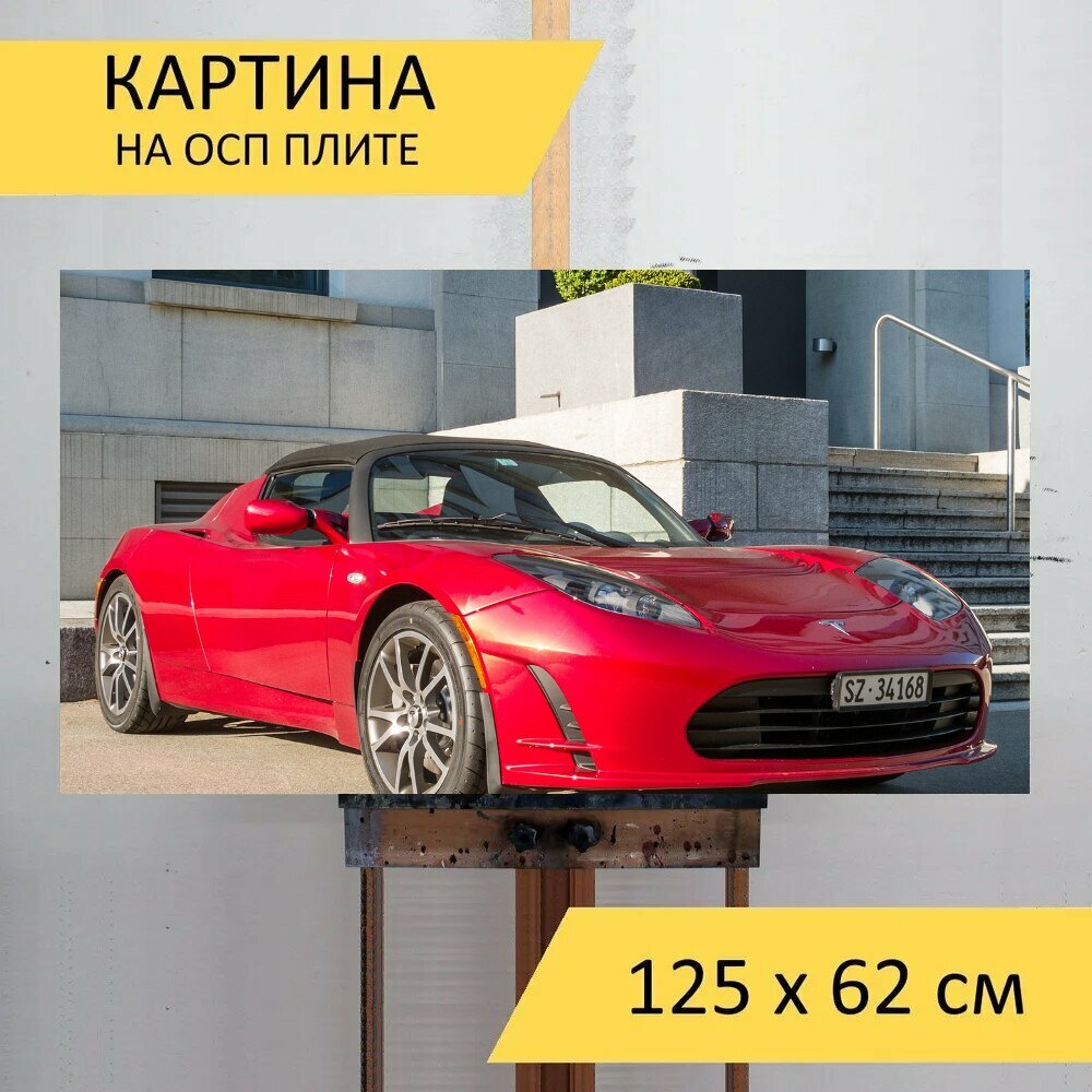 Картина на ОСП 125х62 см. "Тесла автомобиль, красный кабриолет, красный спортивный автомобиль" горизонтальная, для интерьера, с креплениями интересное: