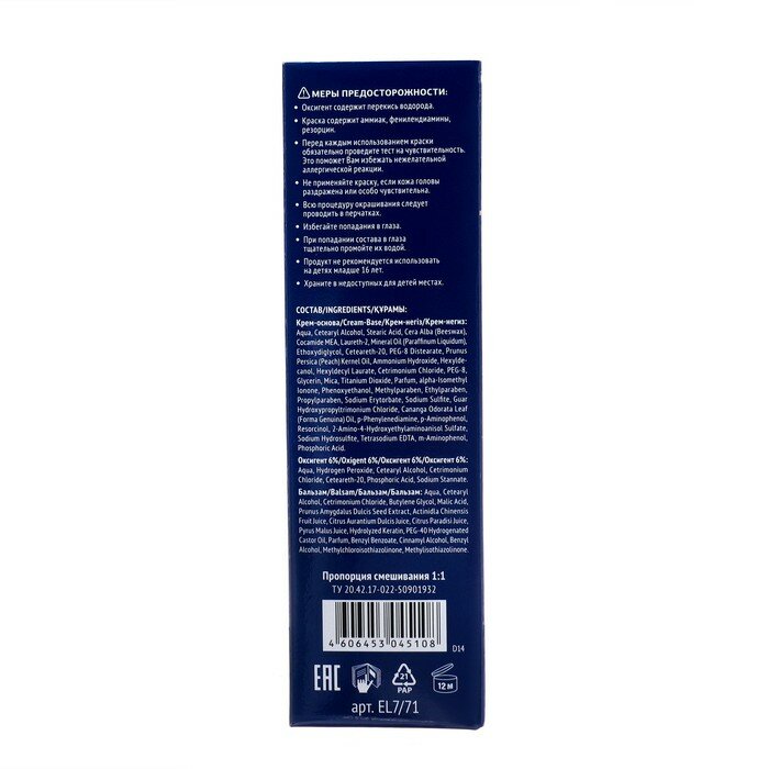 | Дополнительная информация | тест на чувствительности: приготовьте смесь из небольшого количества крем-основы и такого же объёма оксигента, перемешав их в любой неметаллической посуде. Не следует готовить весь объем краски. Нанесите приготовленную смесь на небольшой участок кожи на внутренней стороне локтевого сгиба или за ухом и оставьте на 10-15 минут. Затем смойте. Если в течение суток признаки аллергической реакции не появились, можете использовать краску |