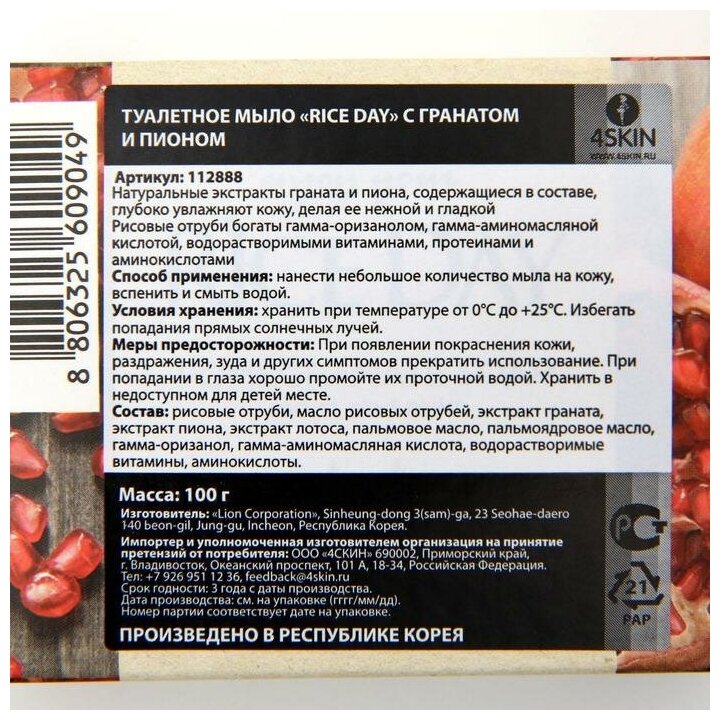 Rice day Мыло туалетное, Гранат и пион, 100 г