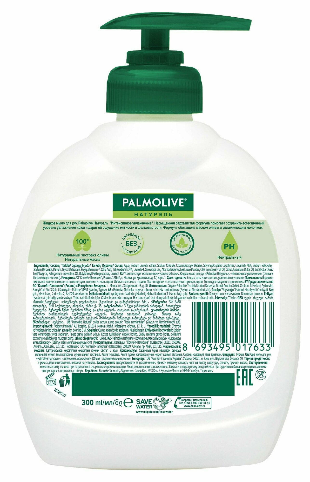 Мыло жидкое 300 мл, PALMOLIVE натурэль "Олива и увлажняющее молочко", дозатор, 1763, 8693495017633 (цена за 1 шт.)