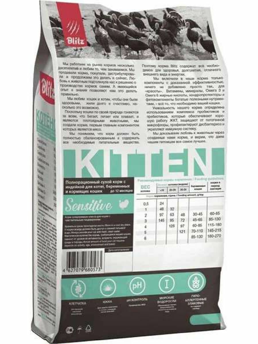 Корм Blitz Sensitive Kitten для котят, беременных и кормящих кошек, с индейкой, 2 кг