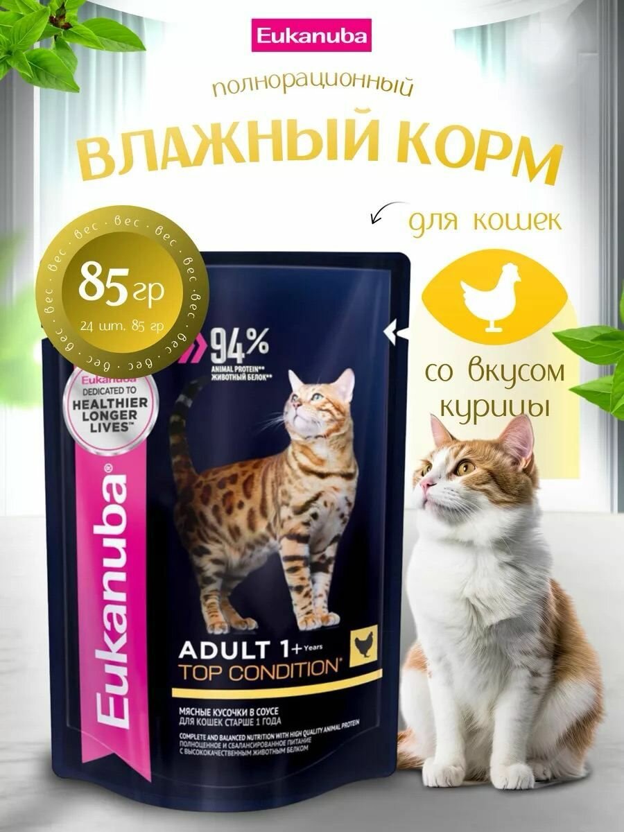 Корм влажный Eukanuba Adult +1 Top Condition для взрослых кошек, с курицей в соусе 24шт.*85 г
