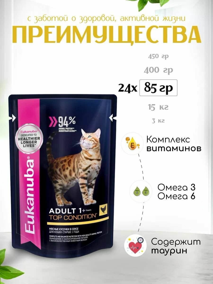 Влажный корм для кошек Eukanuba Top Condition, для здоровья кожи и блеска шерсти, с курицей 24 шт. х 85 г (кусочки в соусе)