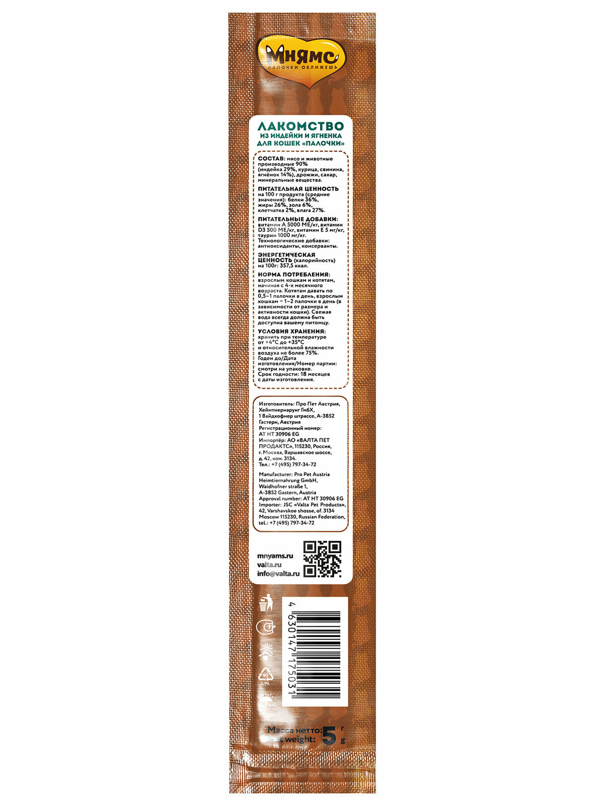 Мнямс лакомые палочки 13,5 см для кошек 3х5 г из индейки и ягненка NEW