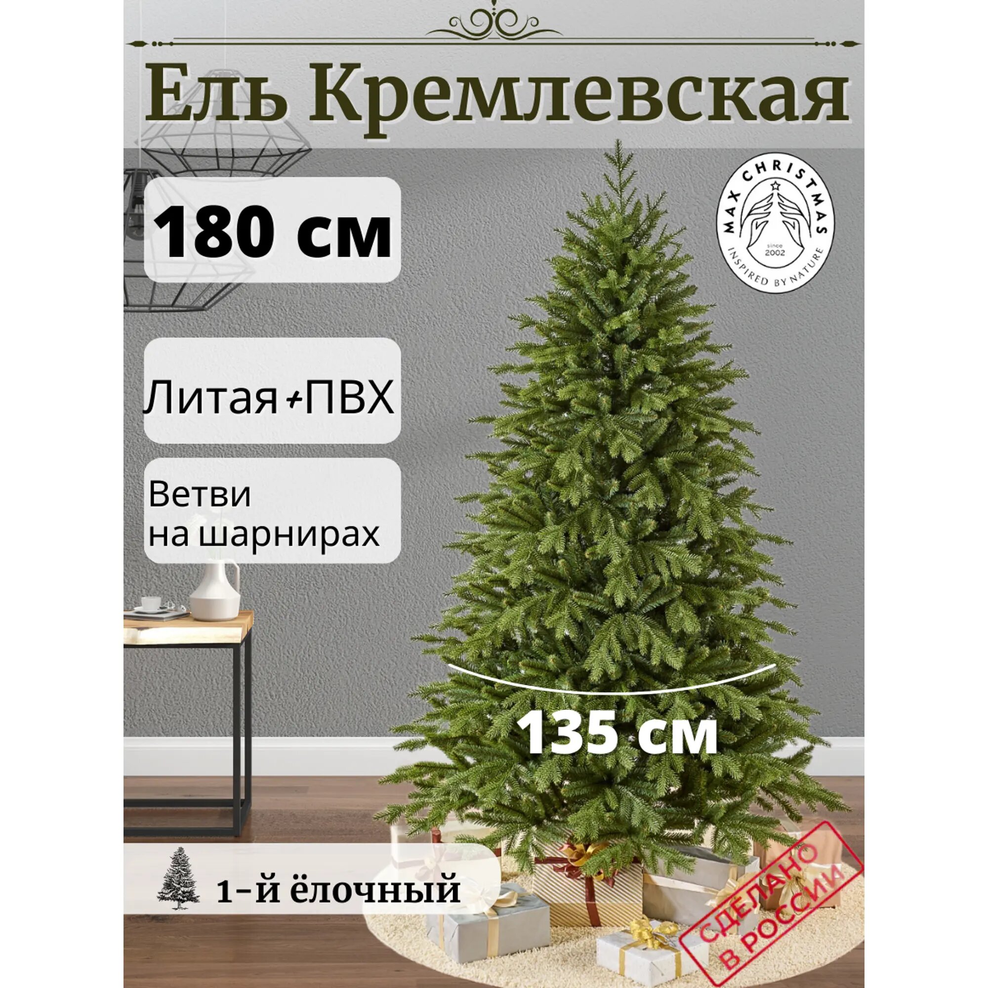 Max CHRISTMAS Искусственная елка Кремлевская 180 см в деревянном кашпо, литая + ПВХ ЕВК 18