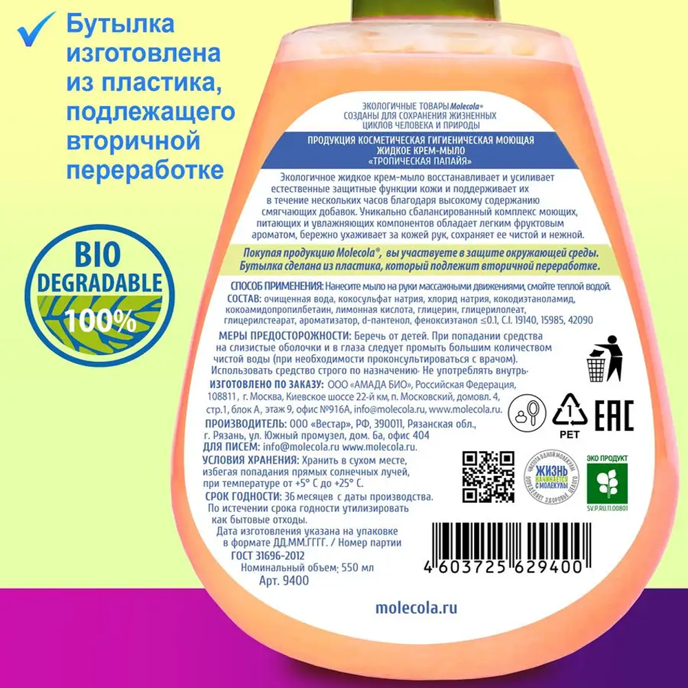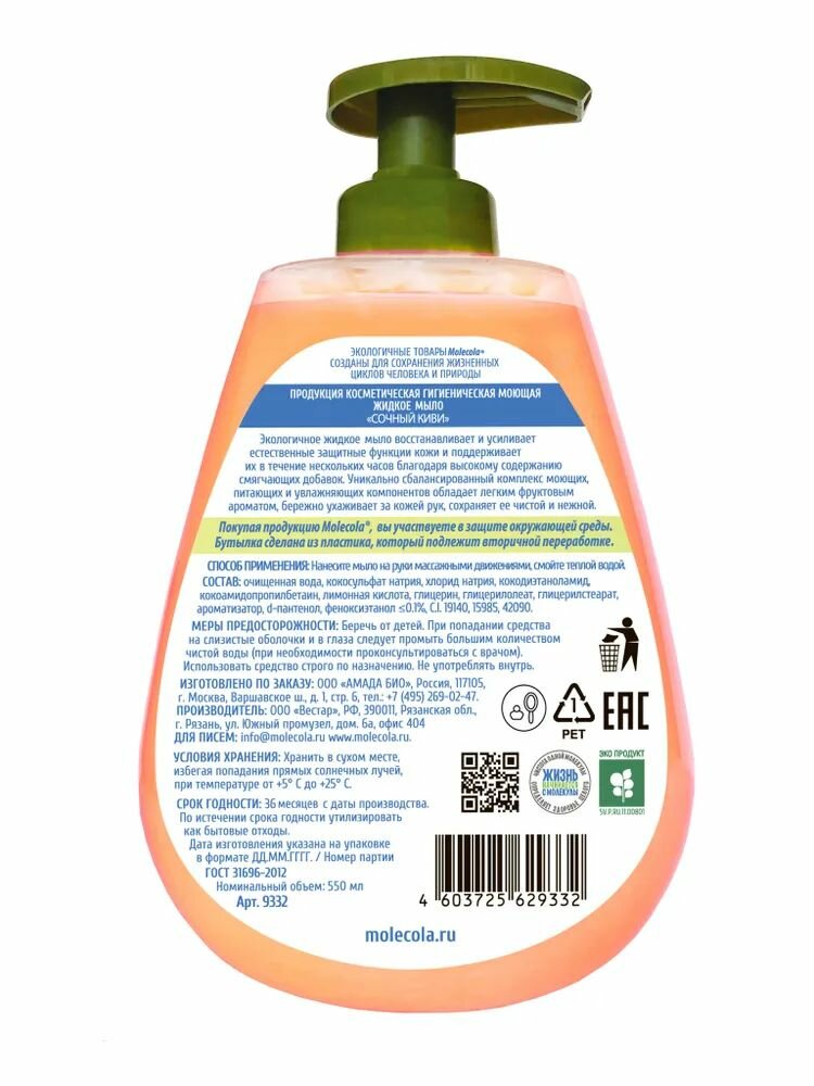 Molecola Крем-мыло жидкое Экологичное Тропическая папайя, 500 мл, 500 г