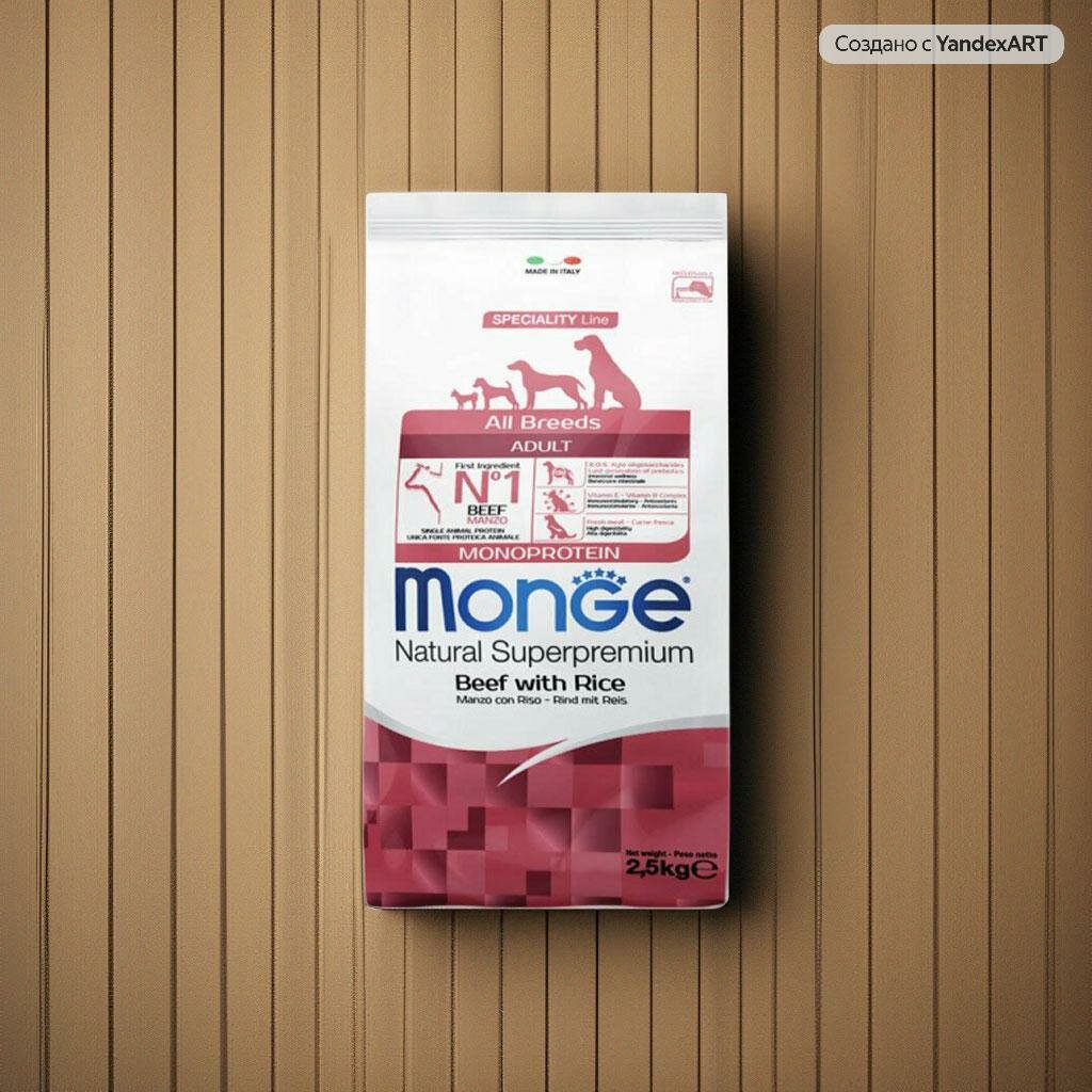Monge Dog Monoprotein корм для взрослых собак всех пород, говядина и рис 2,5 кг
