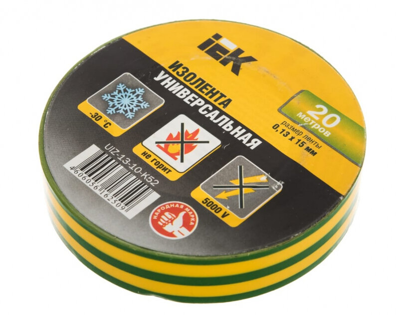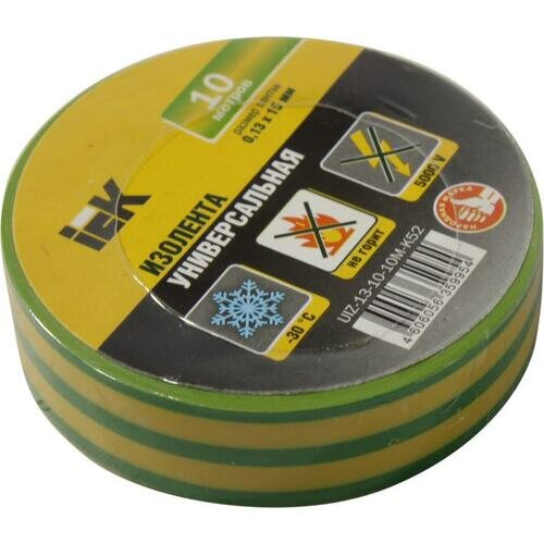 Изолента Iek ПВХ 0.13х15мм (рул.10м) желт./зел., UIZ-13-10-10M-K52