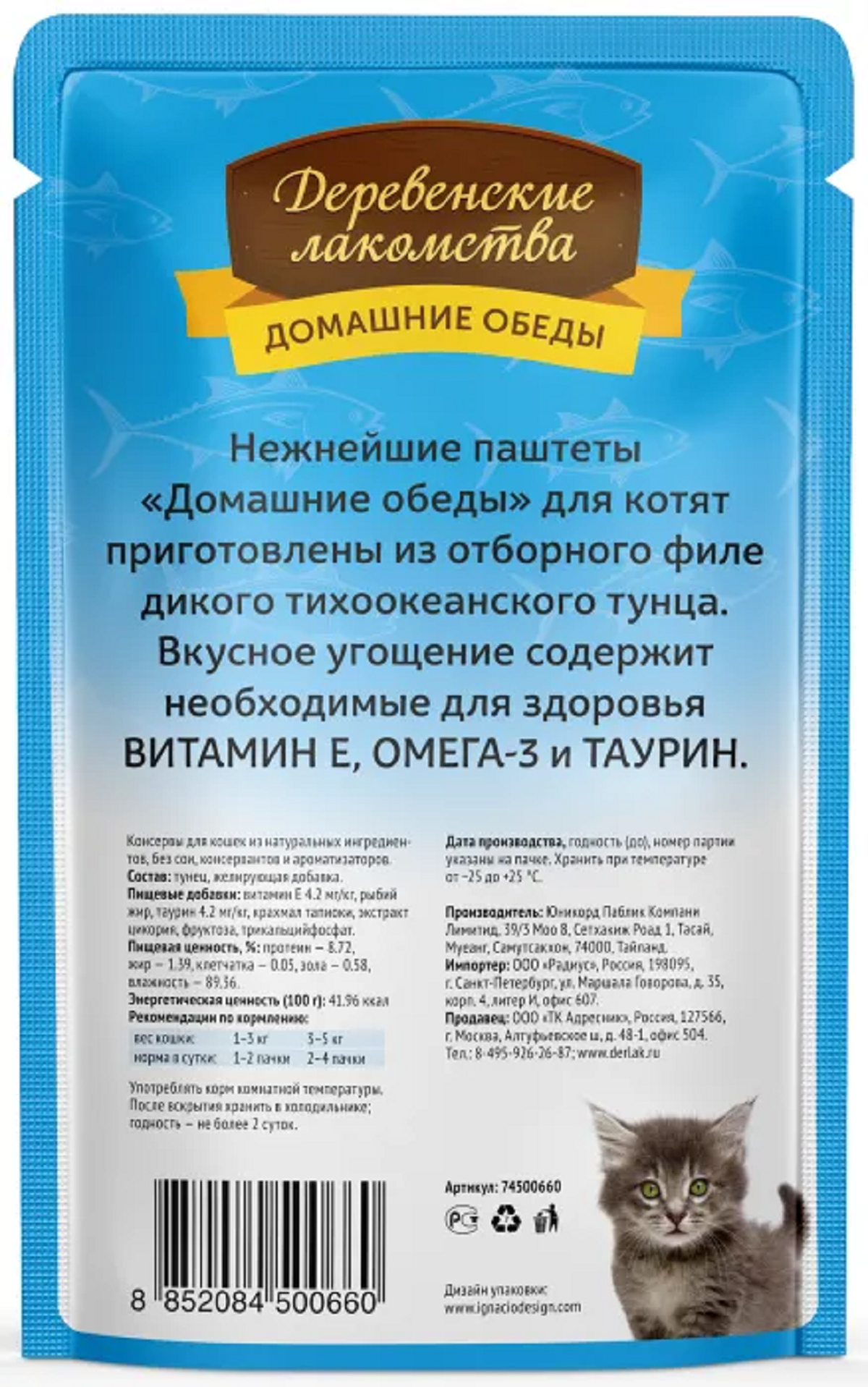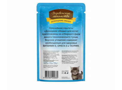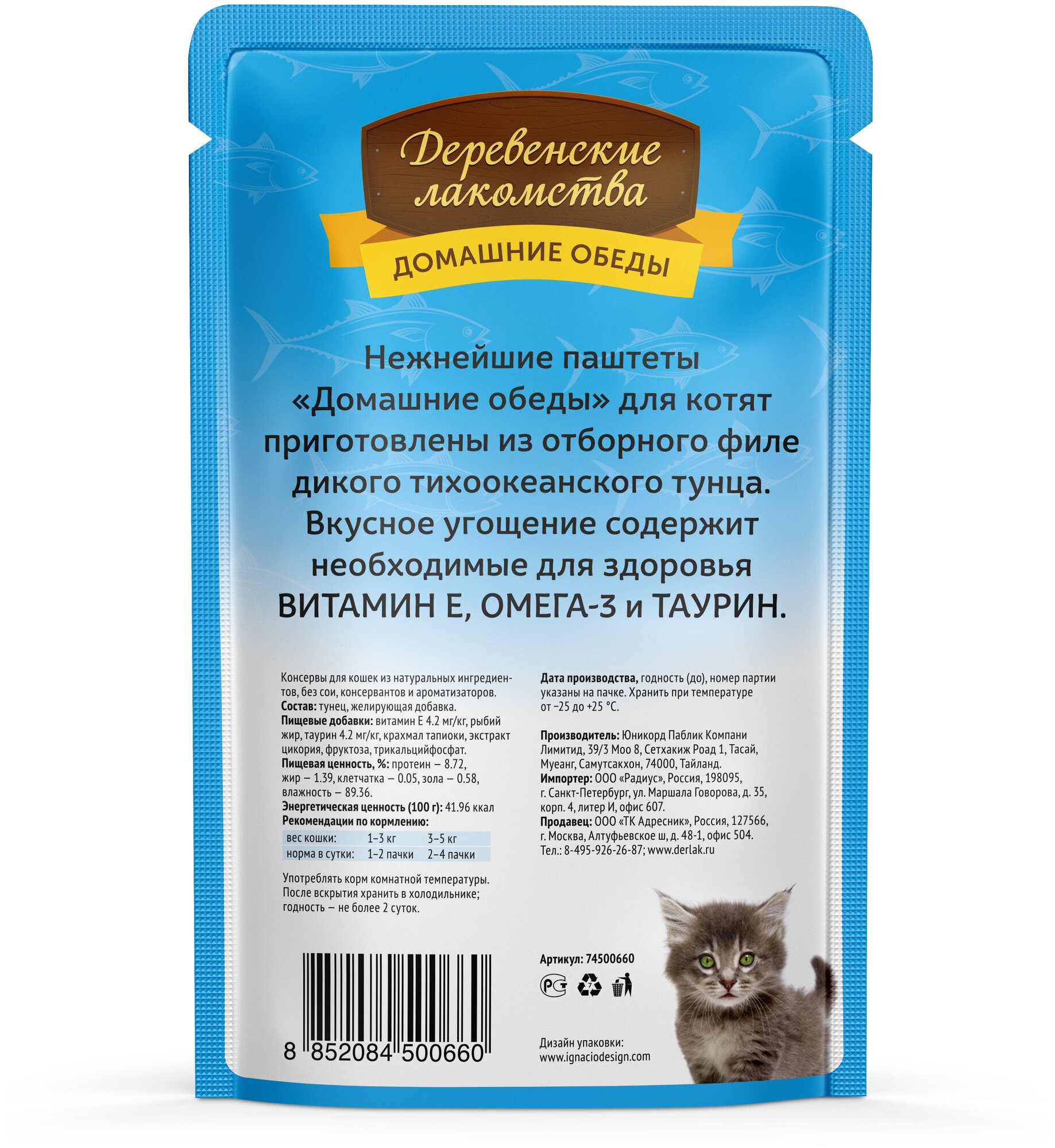 Деревенские лакомства Влажный корм для котят Домашние обеды, "Отборный тунец", 70 г, 2 шт