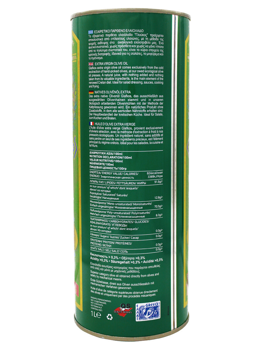 Оливковое масло первого холодного отжима высшего качества Glafkos Extra Virgin, кислотность 0,3%, ж/б, 1 литр, Греция