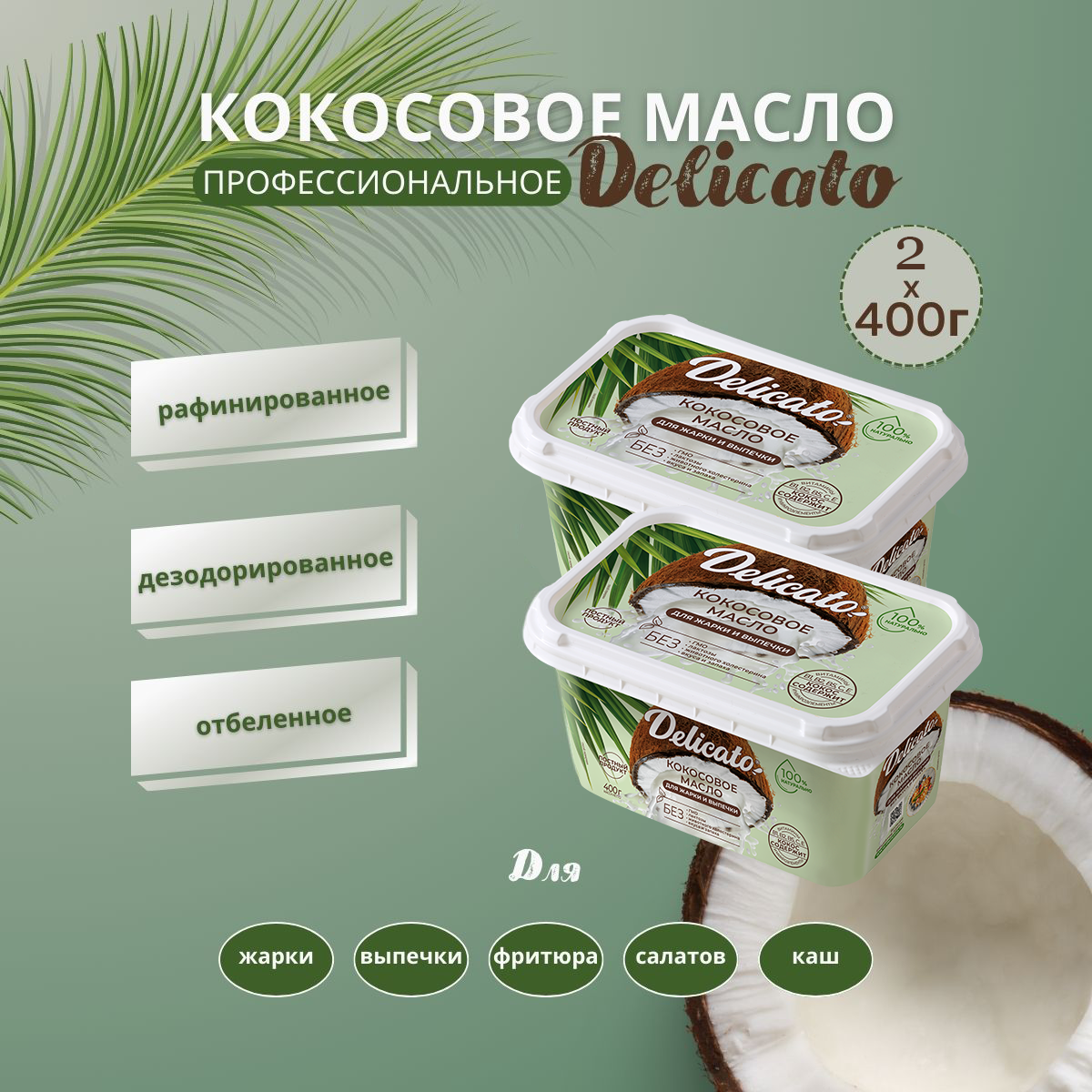 Купить Кокосовое масло Delicato 800 г ( 2х400 г) пищевое для жарки, выпечки и фритюра