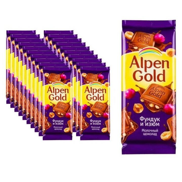 Шоколад Alpen Gold молочный с фундуком и изюмом, 85 г, 21 шт. в уп., 21 уп.